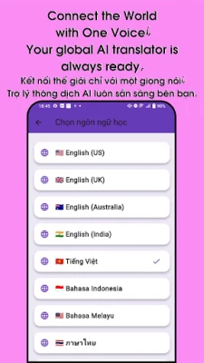 Purple Lang AI ni suluhisho lako la mawasiliano duniani. Tafsiri na ongea kwa lugha 58 tofauti, ukitumia vipengele 16 vya akili bandia kuboresha uzoefu wako wa lugha kwa urahisi na ufanisi.