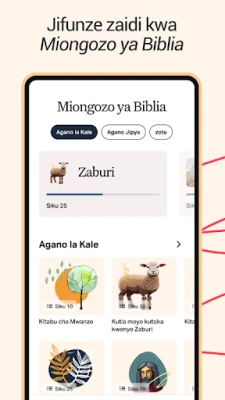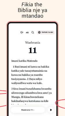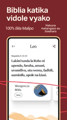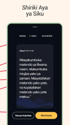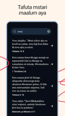 Leta nuru kwa wengine kwa urahisi ukitumia kipengele cha kushiriki. Unda picha za kuvutia zenye mistari ya Biblia na uwatie moyo marafiki na familia yako kupitia mitandao kama WhatsApp, Facebook, na Instagram. Biblia Nje ya Mtandao ya YouVersion inatoa uzoefu kamili wa kiroho, ikiunganisha usomaji wa Kiswahili na Kiingereza, pamoja na sauti, katika kifurushi kimoja chepesi. Imebuniwa kukuhudumia kikamilifu bila kukutwisha mzigo wa matangazo. Fanya Neno la Mungu kuwa sehemu ya safari yako ya kila siku, iwe uko nyumbani au safarini.